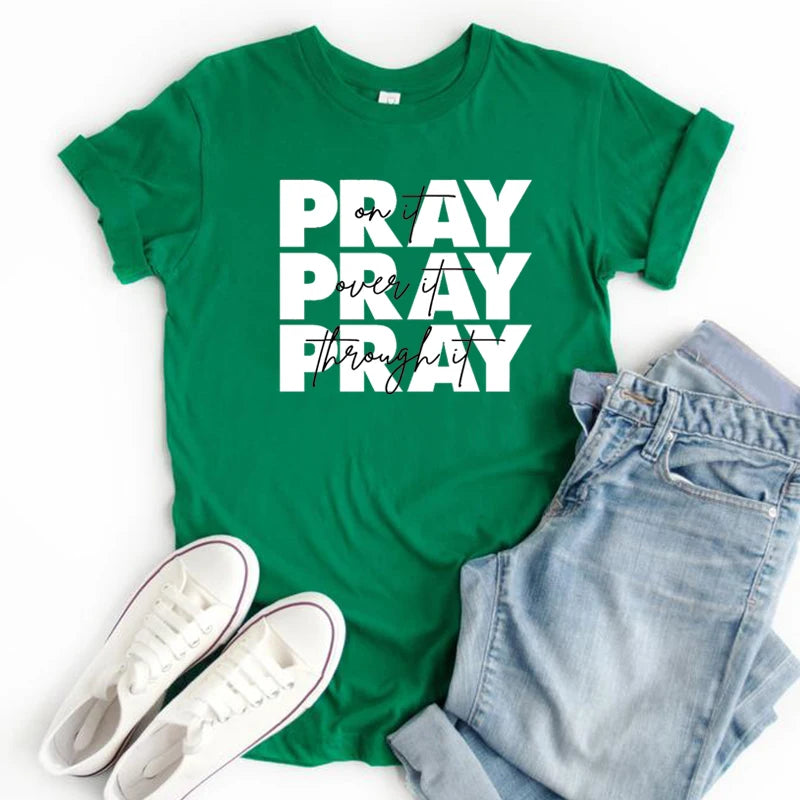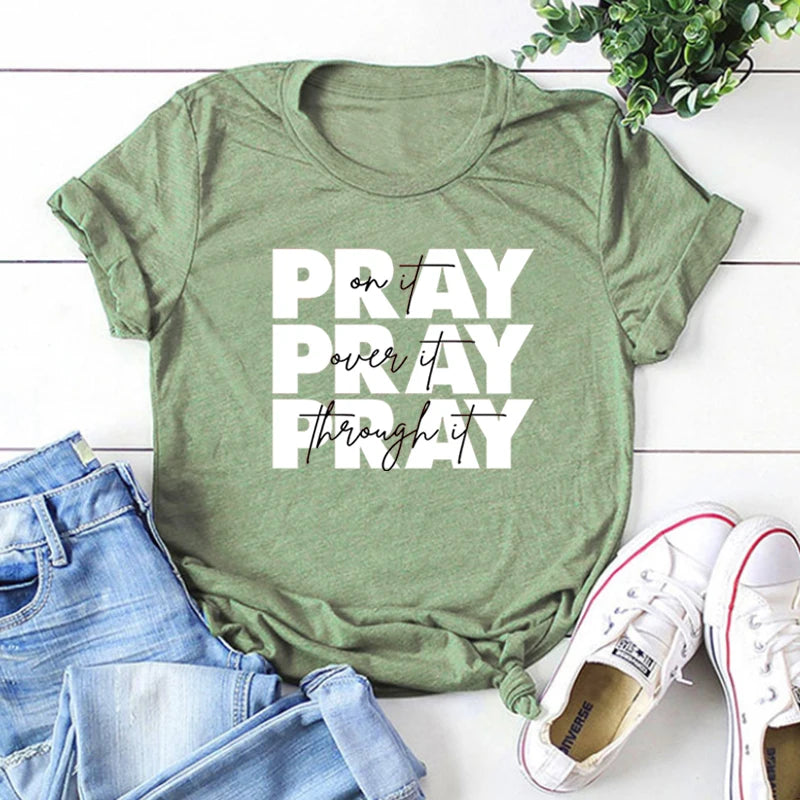 Pray On It, Over It, Through It Women’s Faith Tee – Spiritual Style