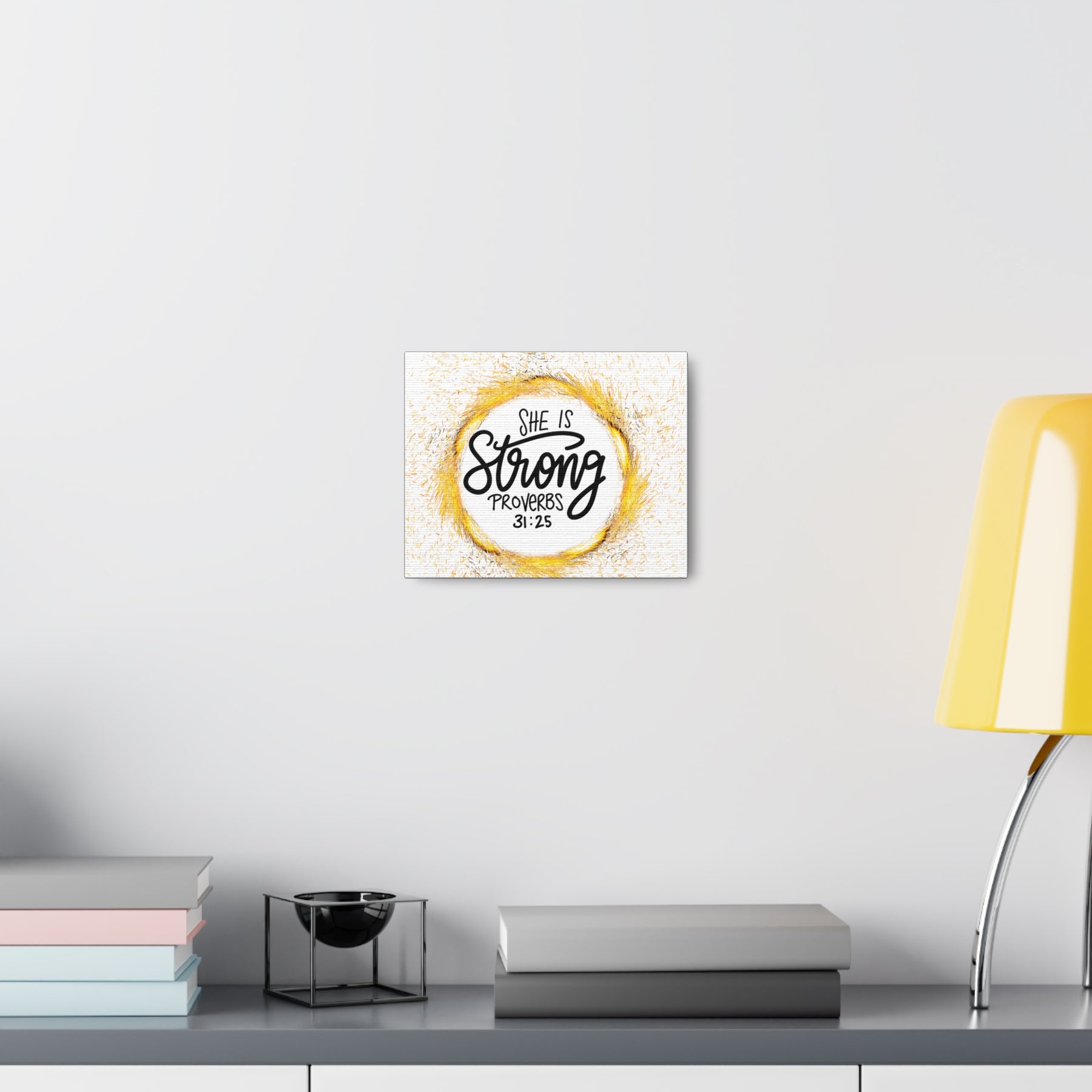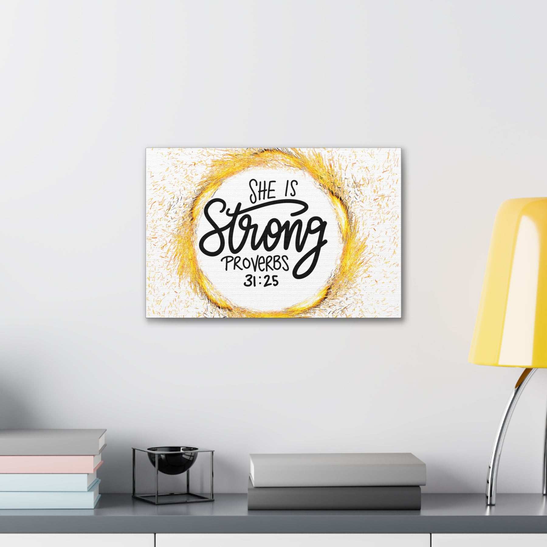 She Is Strong Scripture Canvas Wall Art - a timeless design wrapped in a radiant golden circle that symbolizes unshakable strength and grace. This stunning canvas doesn’t just decorate your walls - it uplifts your spirit. Perfect for bedrooms, living rooms, and offices, it’s a daily reminder that strength lives within you.