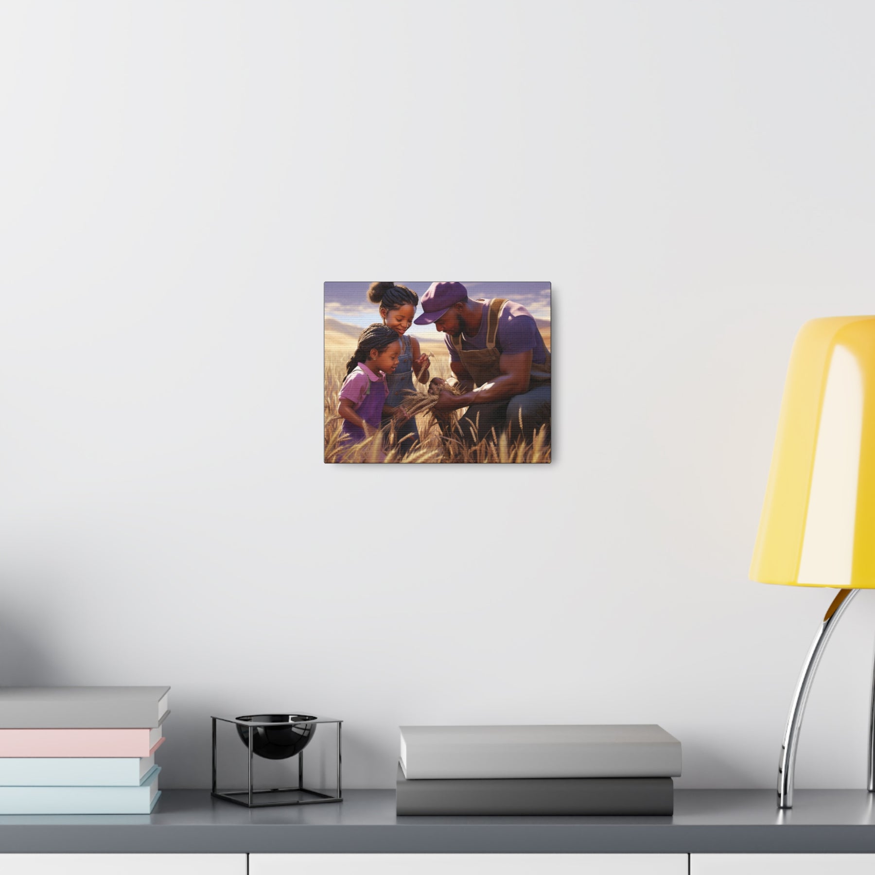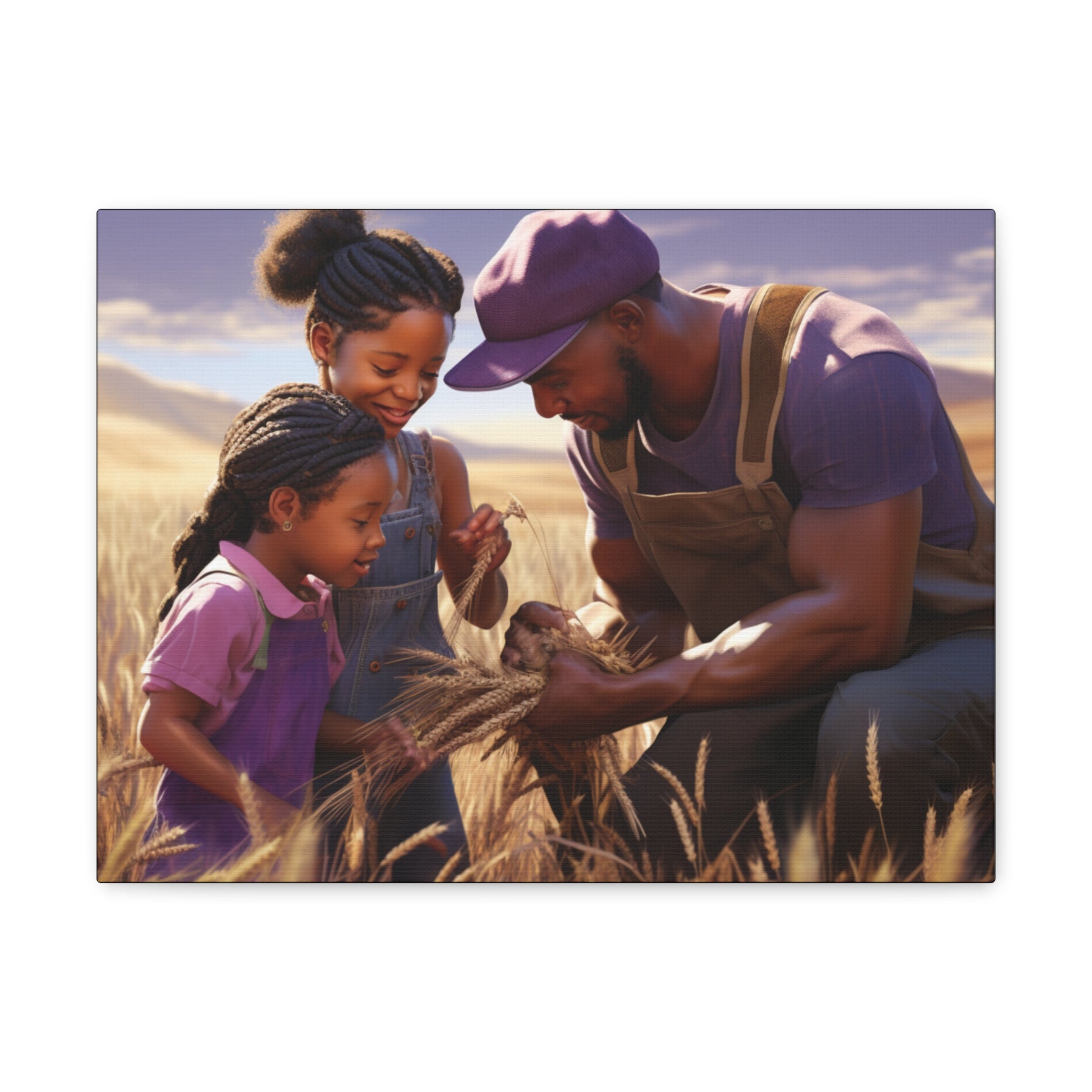 This heartwarming masterpiece portrays an African American father, dressed in classic overalls, sharing his wisdom about wheat with his two beautiful daughters in a sunlit field. It’s a radiant scene of love, learning, and legacy—perfect for sparking conversation and creating a meaningful atmosphere in any space.