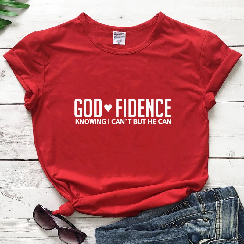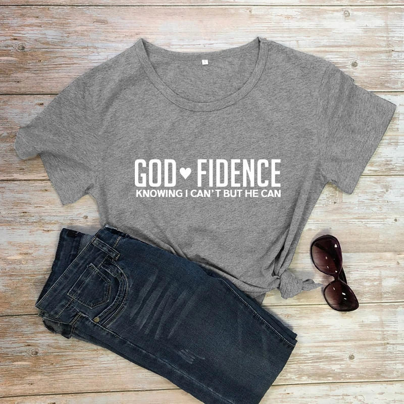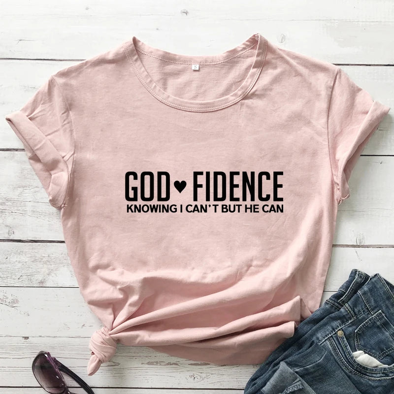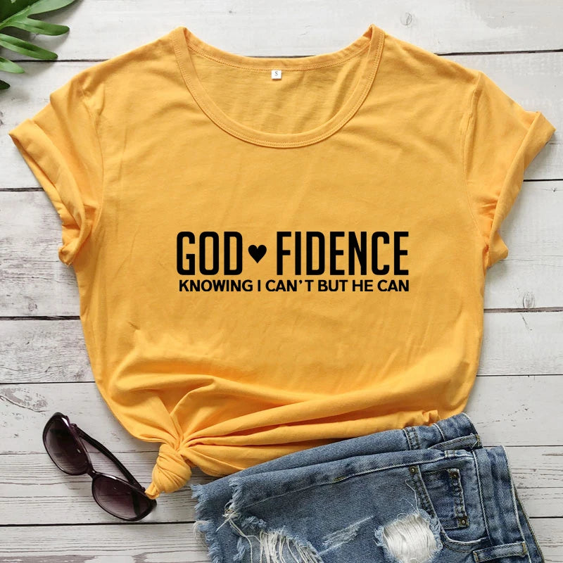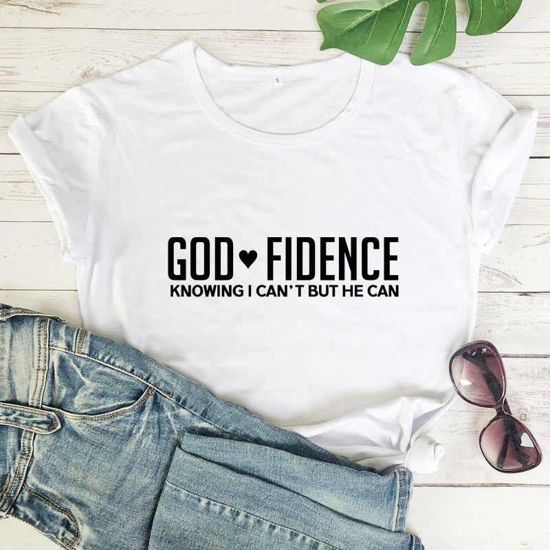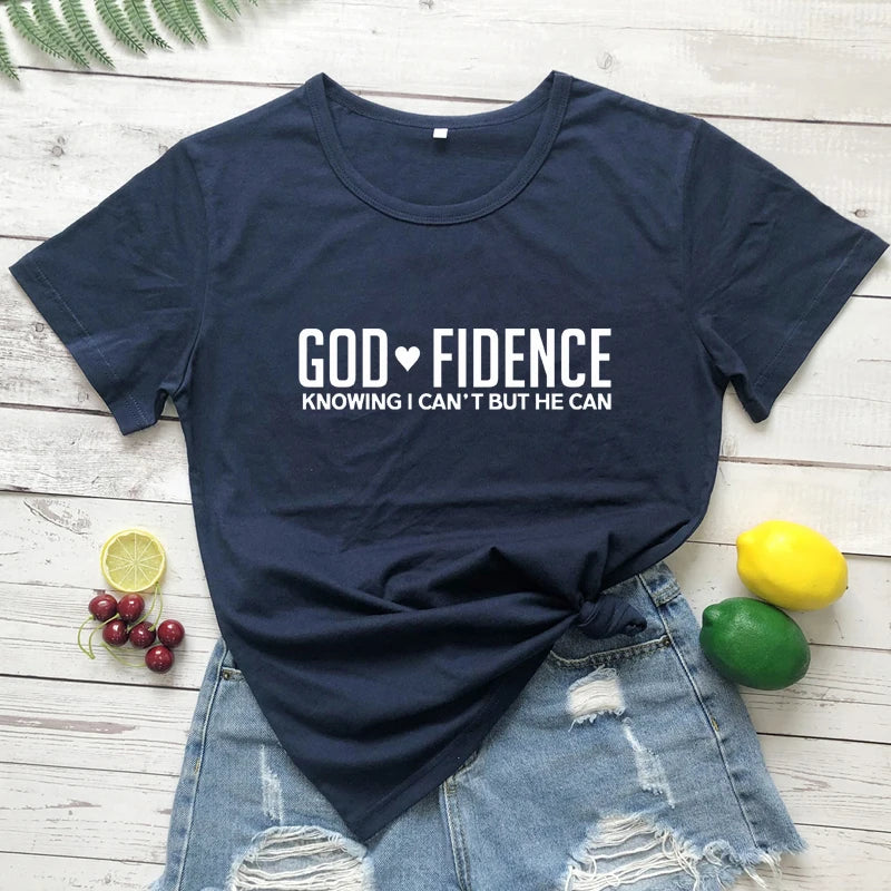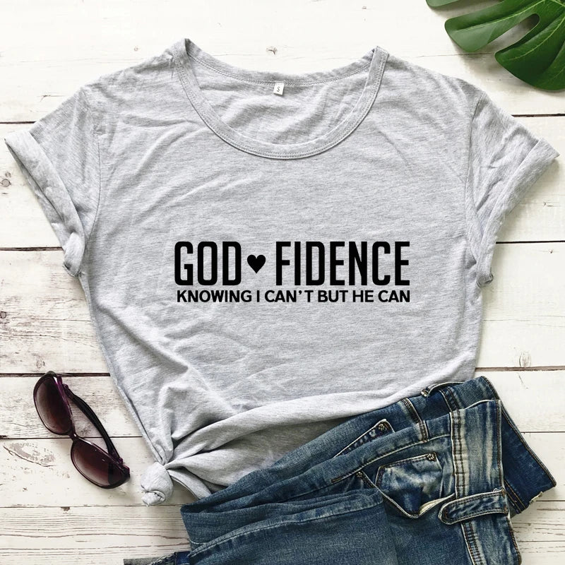 Embrace your faith with our inspiring God-fidence T-Shirt, featuring the powerful phrase "God-fidence: Knowing I can't but He can." This shirt is perfect for anyone looking to showcase their trust in God while spreading a message of hope and empowerment. Whether you're at church, running errands, or hanging out with friends, this tee is sure to spark conversations and uplift spirits!