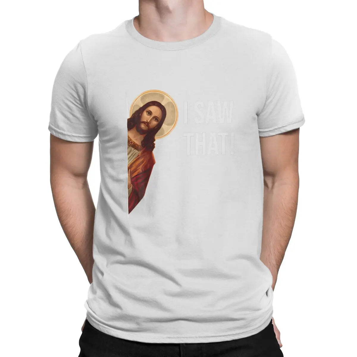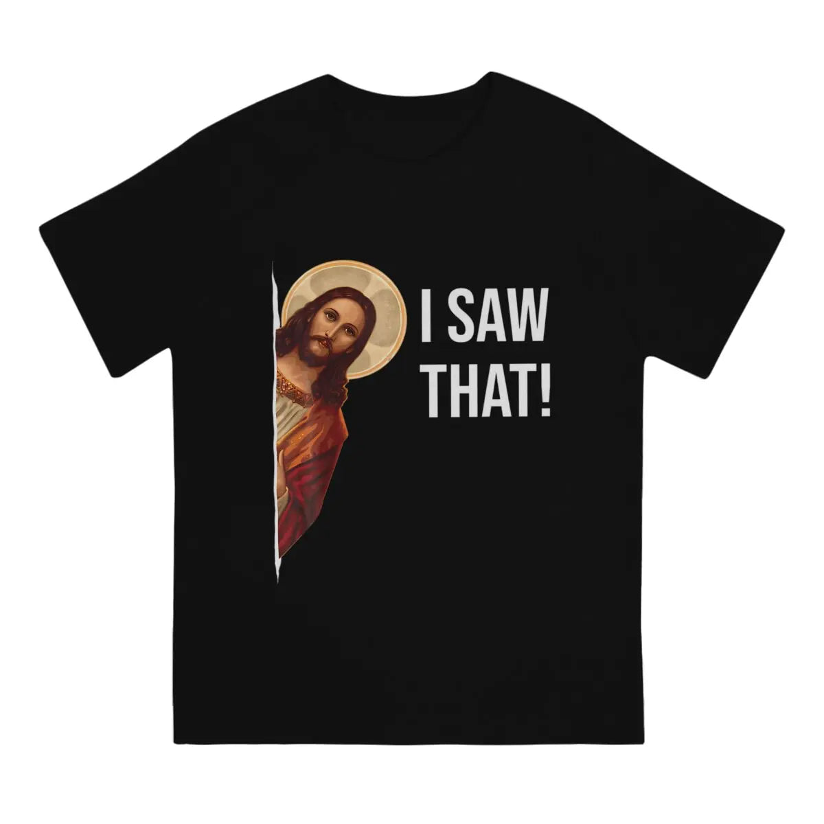 Bold & Unique Design – Jesus' peeking around the corner with “I Saw That.”