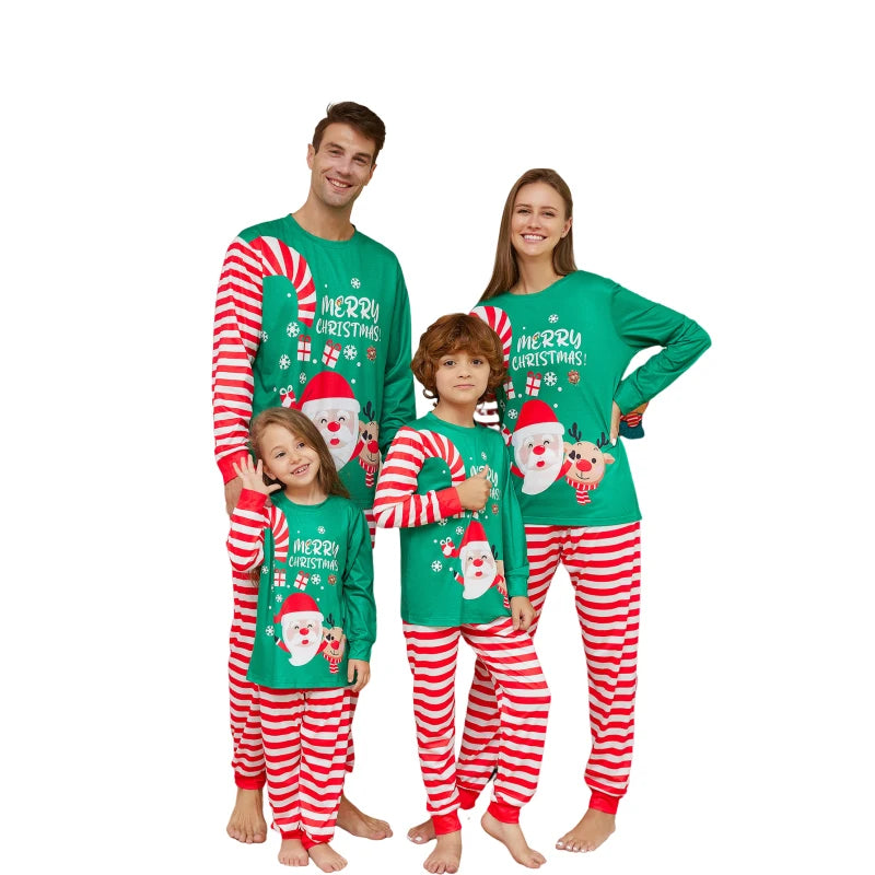 Enter our Matching Merry Christmas Family Pajamas Set — designed to keep everyone comfy, stylish, and full of holiday cheer. From kids to adults, each set features vibrant green tops with bold “Merry Christmas” lettering, fun candy cane stripe sleeves, and matching striped pants for a picture-perfect look. Crafted from soft, breathable fabric, these PJs make every moment — from Christmas Eve to lazy winter mornings — feel like magic.